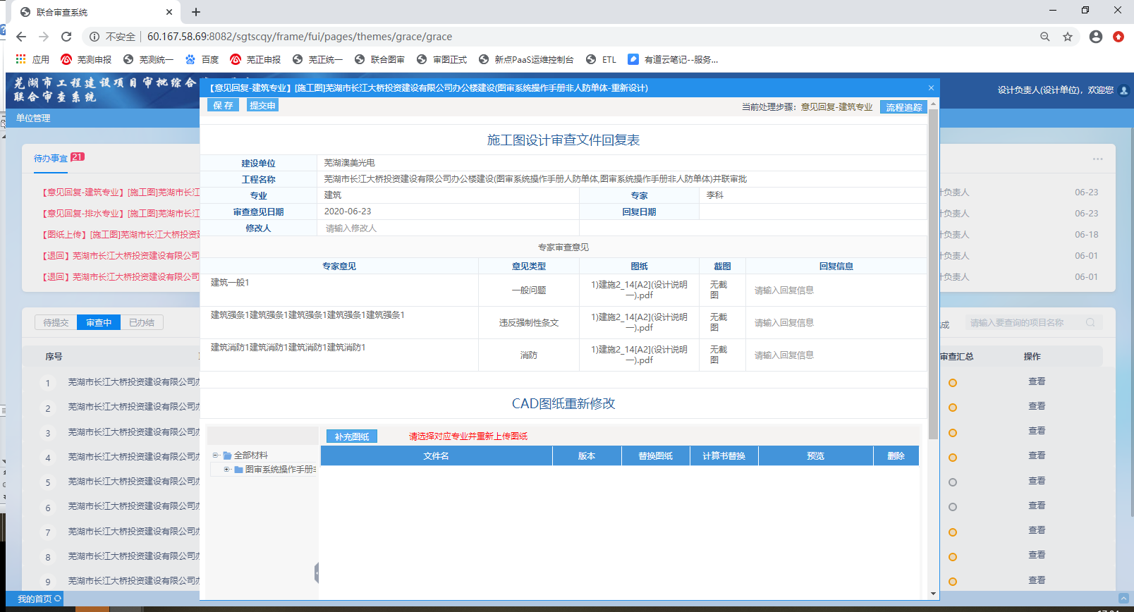 图审人员对图纸审核完成后,如果存在图纸不通过,退回到设计单位进行图纸修改。设计单位项目负责人登录系统,在首页代办中会自动显示意见回复。如下图: